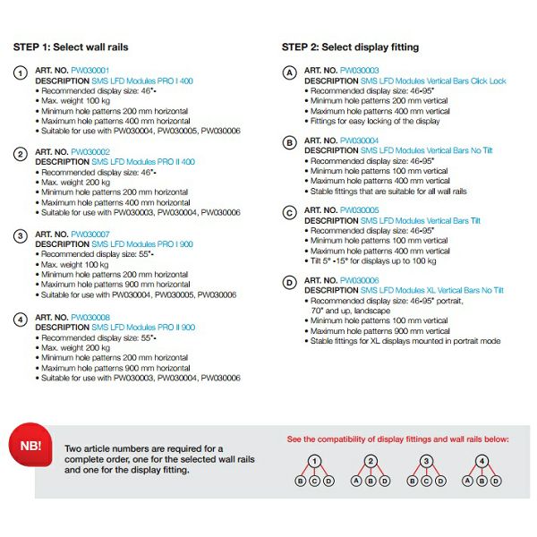 SMS LFD Modules Vertical Bars Tilt nam nudi vertikalen VESA standard od 100 do 400 mm, ter podpira monitor velikosti 46" - 95".